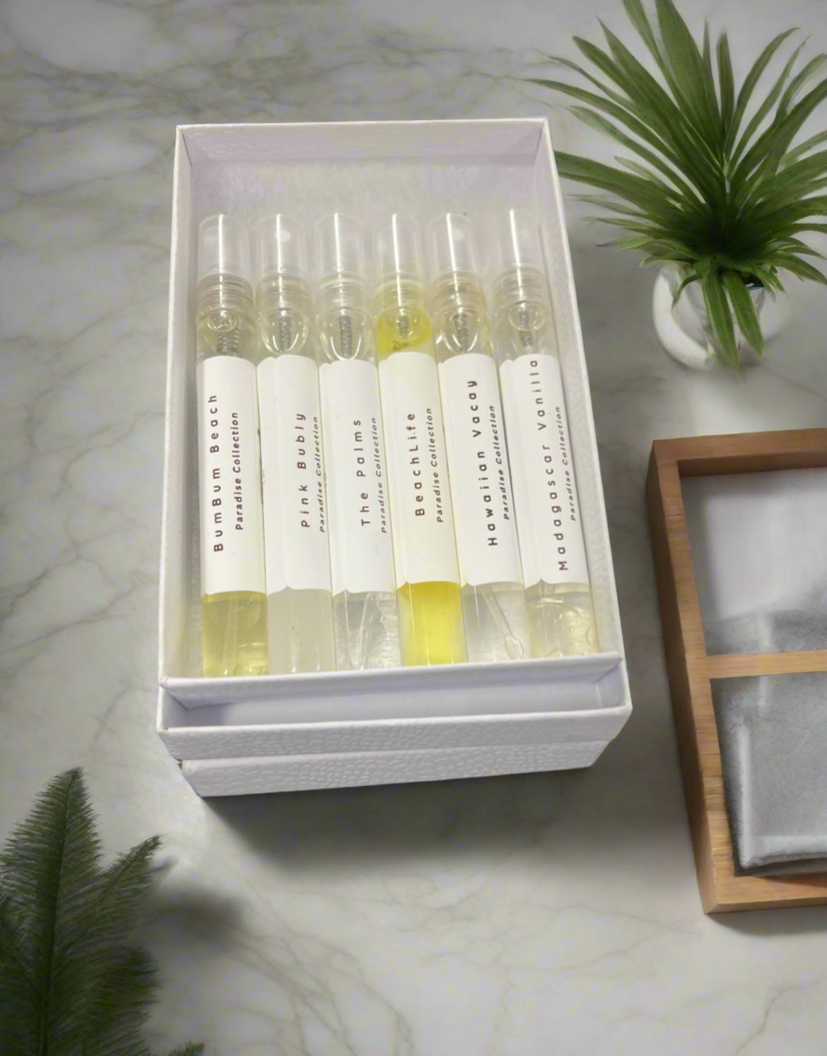 Discover your dream destination with the Paradise Collection – a set of enchanting fragrances that evoke the spirit of island life. Each fragrance in this collection is a journey through tropical landscapes: the creamy richness of coconut groves, the sparkling freshness of citrus orchards, the sensual warmth of amber sunsets, and the soft, soothing notes of white sand beaches. Designed for the modern explorer, these vials are sleek and portable, perfect for slipping into your bag for a touch of paradise on the go. Let the Paradise Collection whisk you away to a world of serenity and tropical wonder.